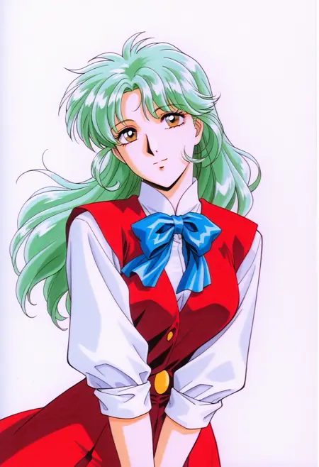 school uniform, white shirt, red vest, red skirt, blue ribbon,