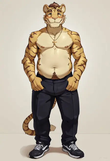 , Carlos_SL, tiger, yellow fur, brown hair, amber eyes, plump, muscular, stoic