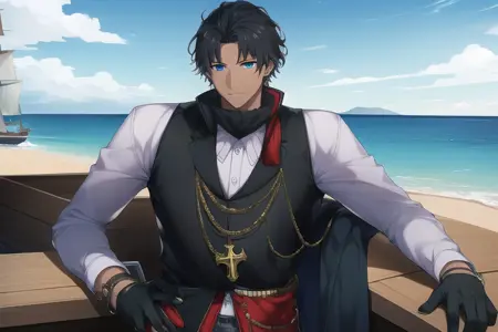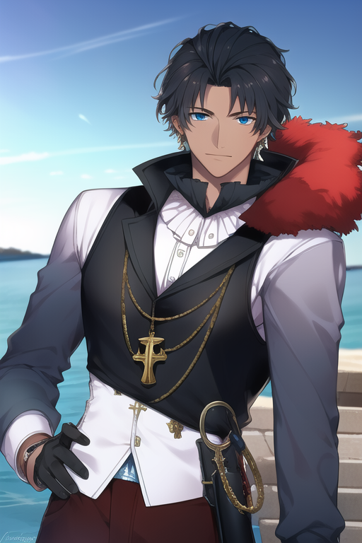 | Trained Words | Bartholomew Roberts(fate), 1boy, black hair, blue eyes, bangs, short hair, gradient hair, dark-skinned male, dark skin, jewelry, red pants, boots, necklace, black gloves, handgun, fur trim belt, white shirt, black waistcoat, cross necklace, sword, shirt,Copied! |