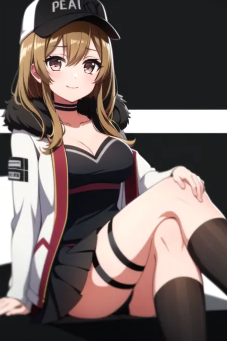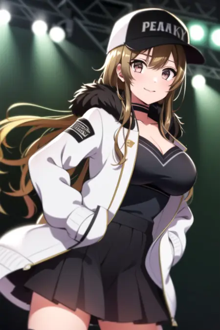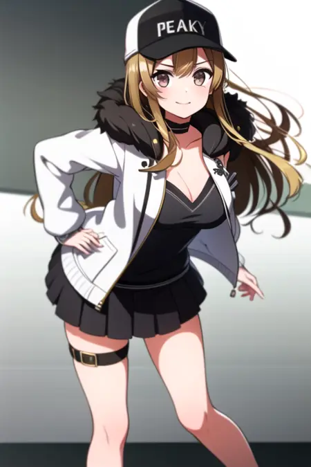 peaky p-key, bangs, belt, black clothes, baseball_cap, black_choker, black_skirt, choker, cleavage, collarbone, fur-trimmed_coat, fur-trimmed_jacket, fur_trim, light brown hair, hat, white jacket, long_sleeves, open_clothes, pleated_skirt, black skirt, smile, thigh_strap