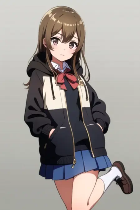 black_jacket, blue_skirt, plaid skirt, school uniform, brick_floor, brown_eyes, brown_hair, hood, hoodie, light brown hair, jacket, long_hair, open_clothes, open_jacket, pleated_skirt, red_bow, school_uniform, shirt, shoes