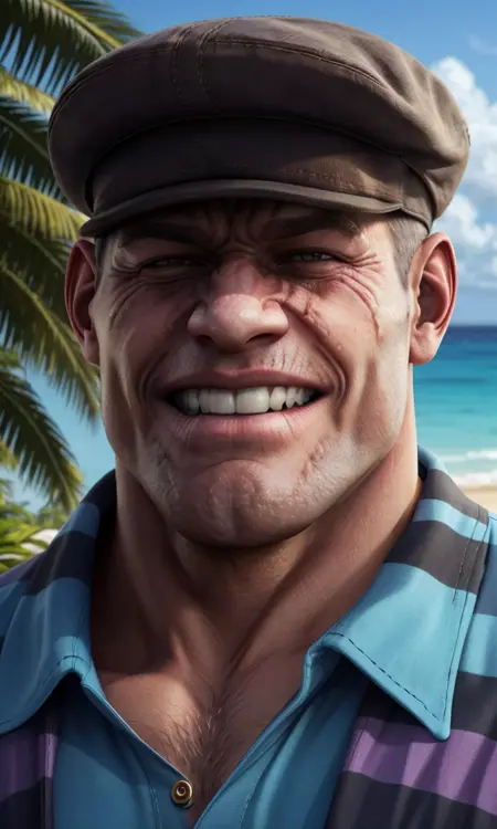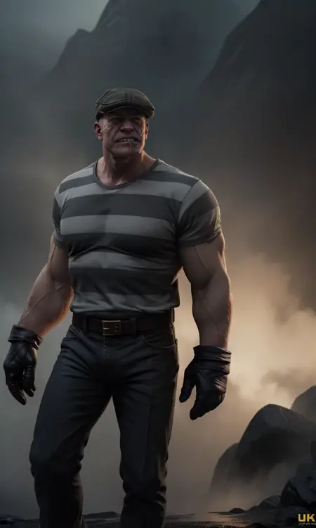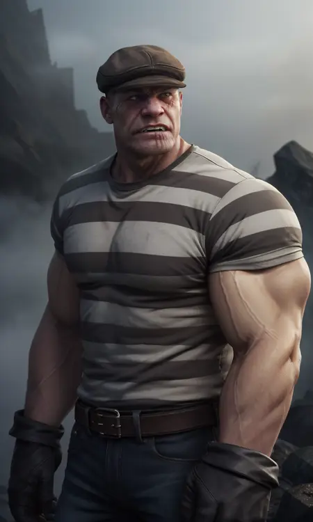 仅使用触发词即可在生成图像中呈现 The Goon,你也可以添加条纹衬衫、手套、平顶帽、伤疤脸和健壮身材等特征。