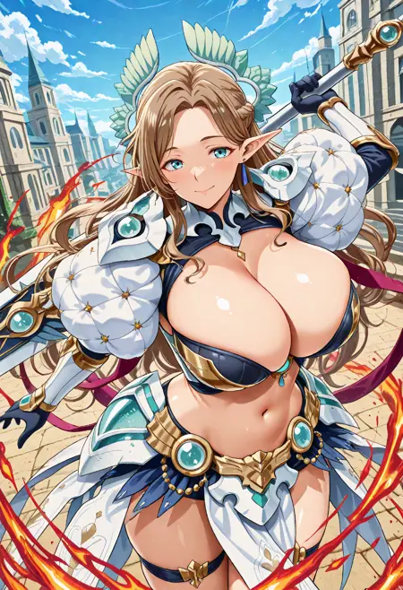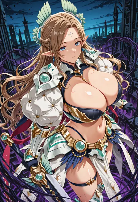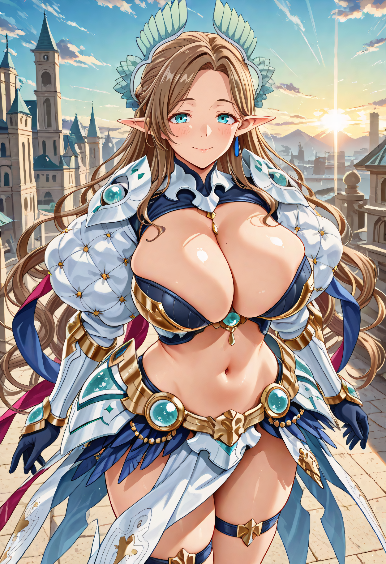 thegrea (cardfight!! vanguard)、茶色の髪、青い目、尖った耳、へそ、長い髪、胸元、大きな胸、鎧、ビキニアーマー、