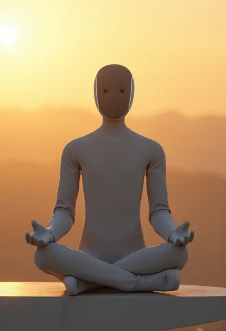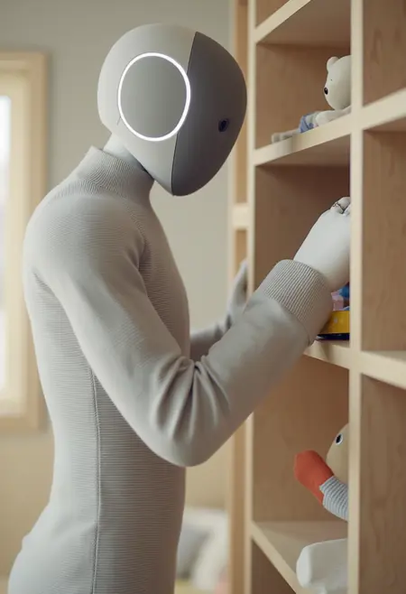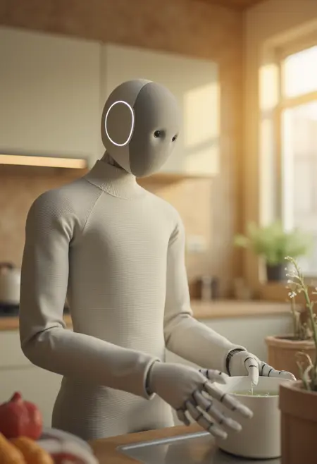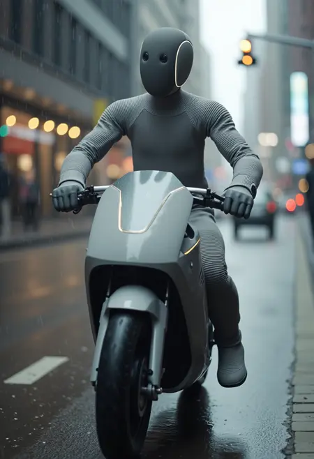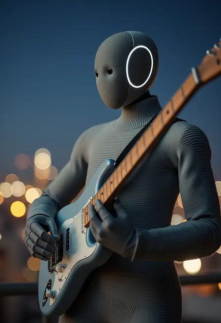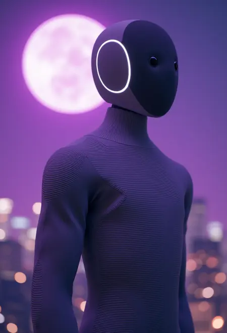 トリガー語: The neorob、人間型のフィギュアで、体全体を覆う薄い縞模様の長袖のリブパターンを持つ。頭部は薄いグレーの生地でできており、中央に大きな楕円形の切り抜きがある。この切り抜きには、その他の部分よりわずかに大きい2つの小さな黒い目が備わっており、対称的な配置になっている。 [ YOUR PROMPT ]