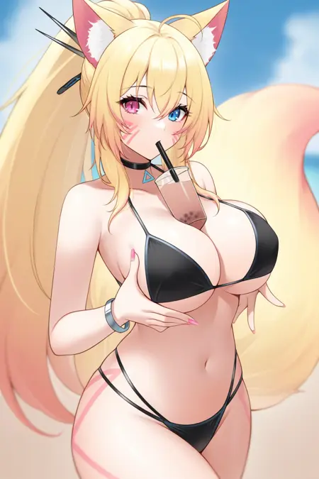 animal ears, tail, long hair, facial mark, barcode tattoo, heterochromia,