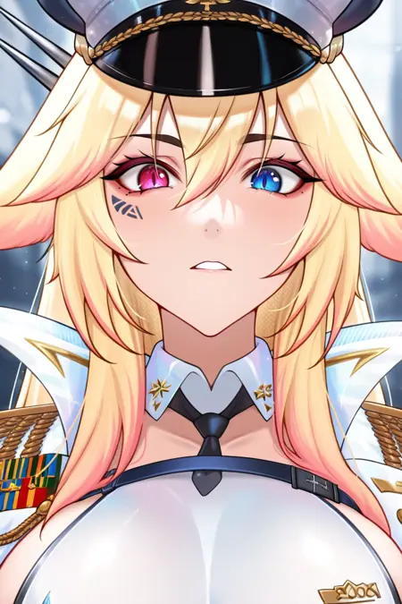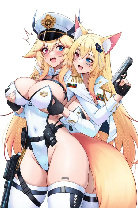 military hat, military uniform, white leotard, white jacket, black necktie, knee boots, fingerless gloves