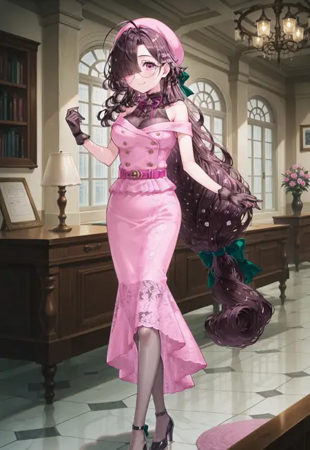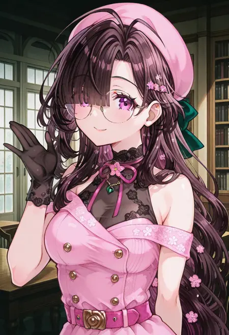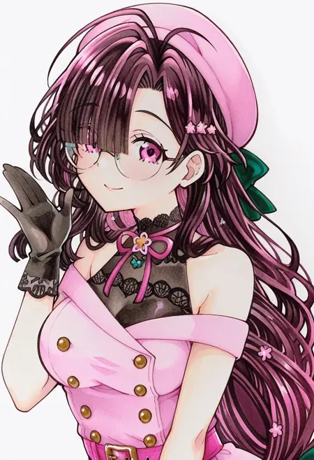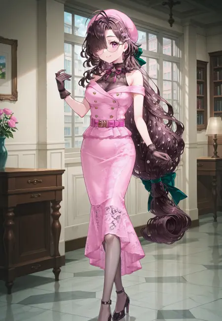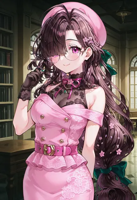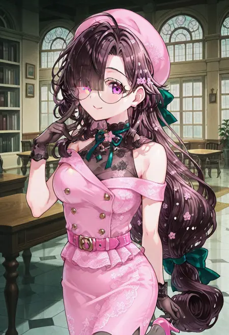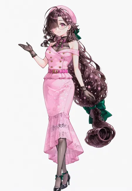 | 학습된 단어 | ononokomachifate, purple eyes, round eyewear, brown hair, long hair, low-tied long hair, hair green bow, blunt bangs, hair over one eye, medium breasts,복사됨! bare shoulders, off shoulder, sleeveless shirt, pink beret, black gloves, double-breasted, buttons, pink dress, pink belt, pink skirt, pencil skirt, medium skirt, grey pantyhose,복사됨! |
