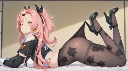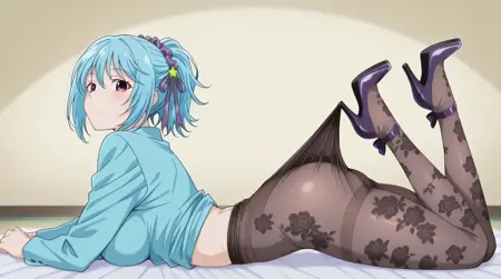 lora:pantyhose-pull-illustriousxl-lora-nochekaiser:1, pantyhose pull, solo, looking at viewer, blush, closed mouth, full body, ass, pantyhose, lying, from side, on stomach, legs up, feet up, high heels, floral print,