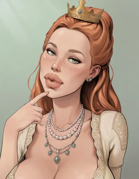Anna Henrietta,黄色胸衣,黄色连衣裙,耳环,珠串项链,长发,前额,橙发,绿眼,雀斑,雀斑,王冠