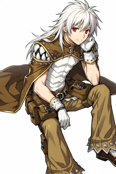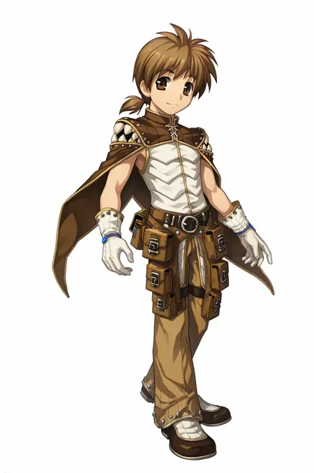 prompt: creatorROMale, brown capelet, sleeveless shirt, white shirt, white gloves, brown cape, belt pouch, long brown pants, shoes
