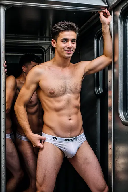 Prompt: A portrait of a {20yo skinny | 50yo | 70yo} man, (shirtless, wearing just white briefs), {hairy body|(hairy body)|(((hairy body)))}, in a crowd old subway car, happy, Nikon d850, hdr, highly detailed, medium shot