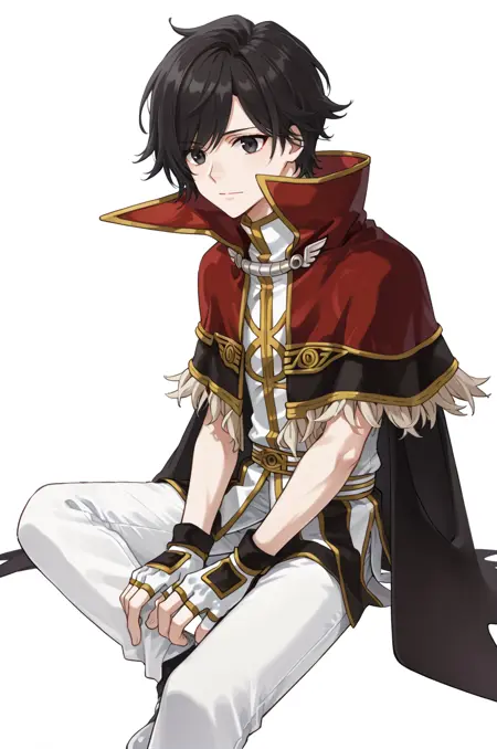 prompt: HiWizROMale, white shirt, high collar, sleeveless shirt, fingerless gloves, cape, capelet, wings, belt, white pants, shoes