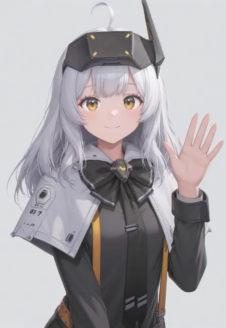 SWI_Nikke, white hair, long hair, ahoge, yellow eyes, headgear,