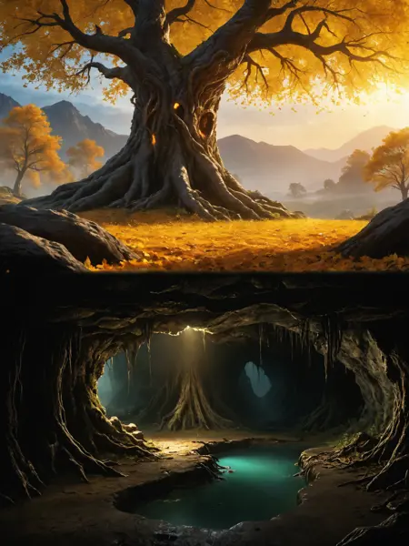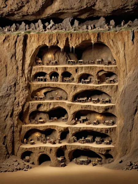 然而在实践中,它主要能成功地呈现正确的横截面视角,但随后会产生一些奇怪的地下结构,这些结构可能有趣,也可能无用。为了获得更好的效果,我建议尝试使用ControlNet和/或Regional Prompter来更好地控制构图。该模型还容易过度渲染根系和网格状结构(如楼梯、架子、梯子)。