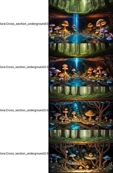 In practice, however, it mostly succeeds in getting the cross-sectional perspective right and then produces strange subterranean features which may or may not be of interest. For improved results I recommend experimenting with ControlNet and/or Regional Prompter to better control composition. It also has a tendency to go overboard with roots and lattice shapes (stairs, shelves, ladders).
