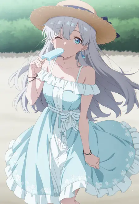 水着1: 長い髪、灰色の髪、青い目、麦わら帽子、サンダレス、ブレスレット、イヤリング、青いドレス
