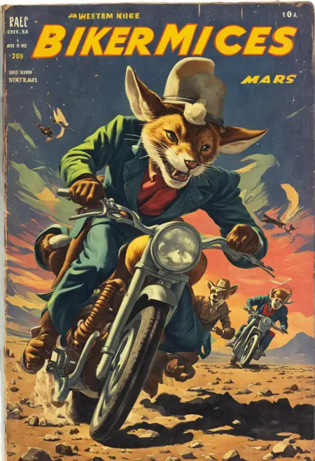 The LoRA adds better ’grittyness’, ’vintageness’ and ’pulpyness’ compared to base flux. Trained on 23 pulp style comic book covers from the 40s-50s.