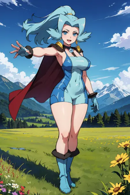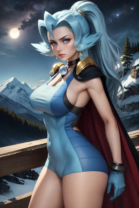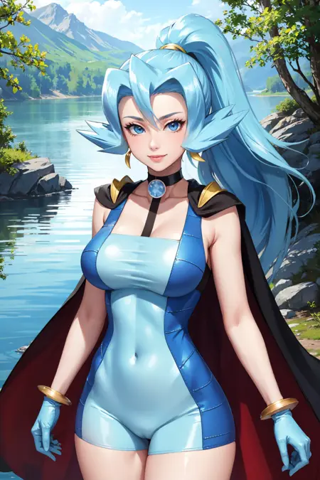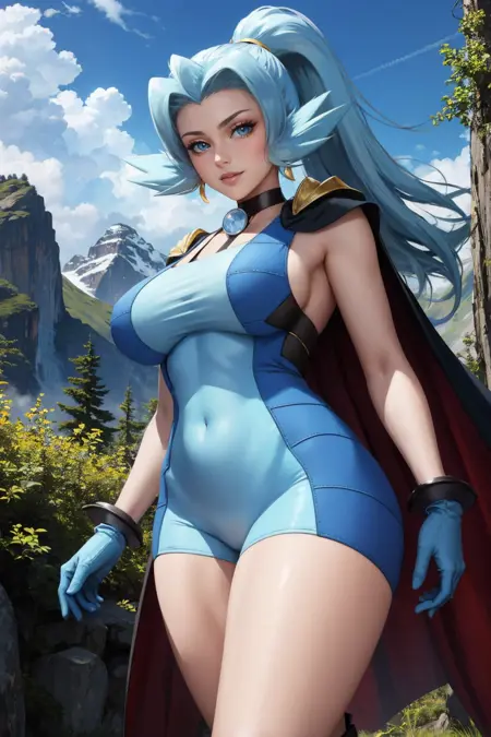 Add "earrings, choker, cape, blue bodysuit, blue gloves, bracelet" for her typical look.