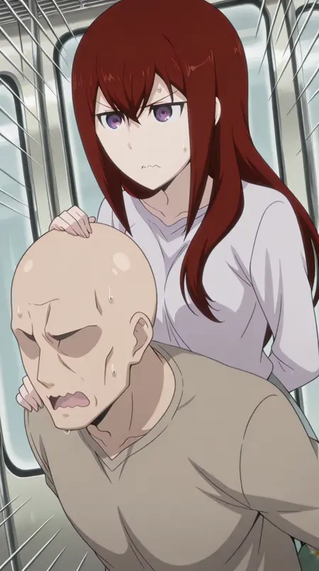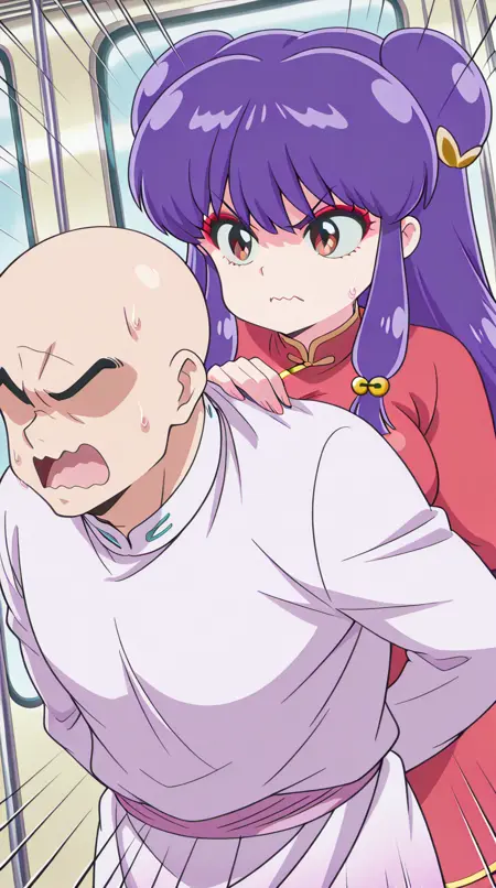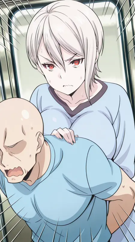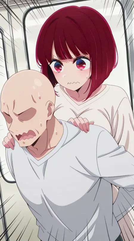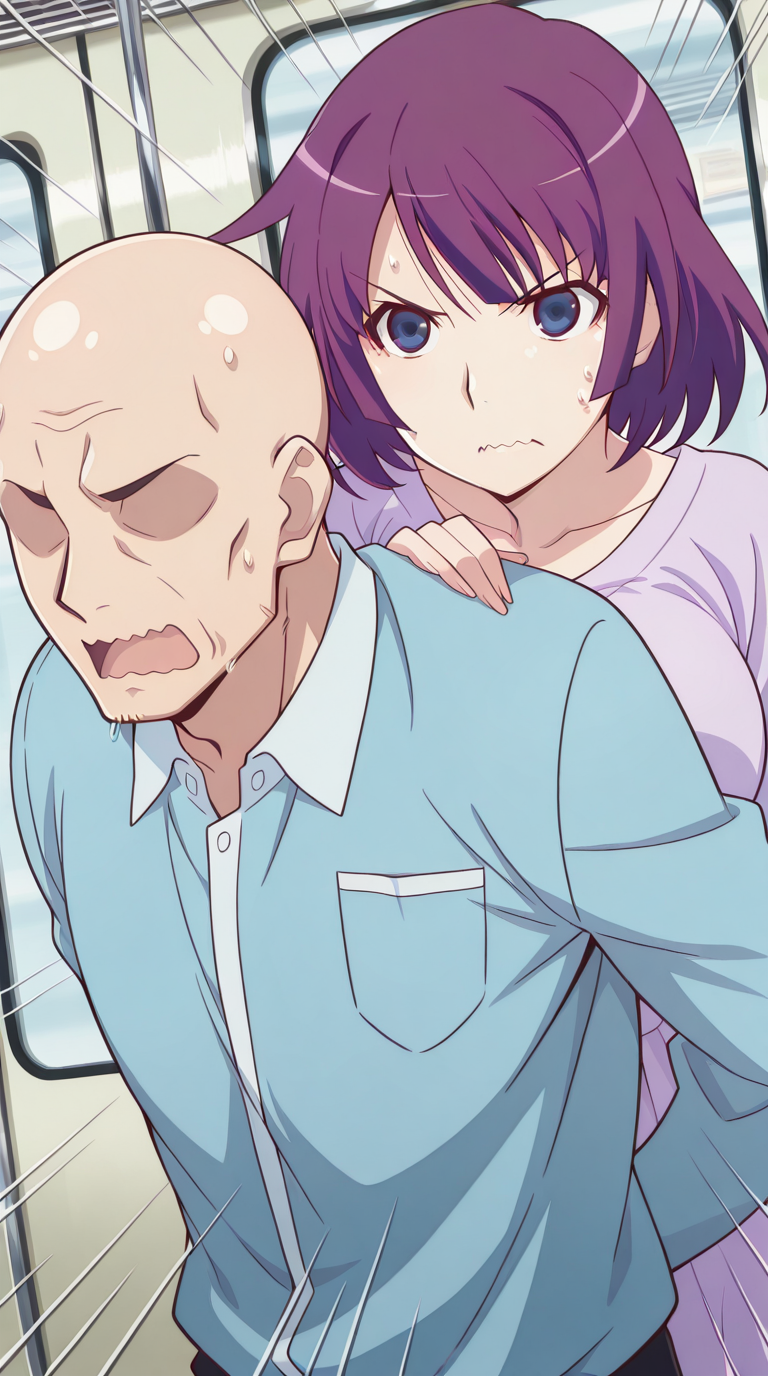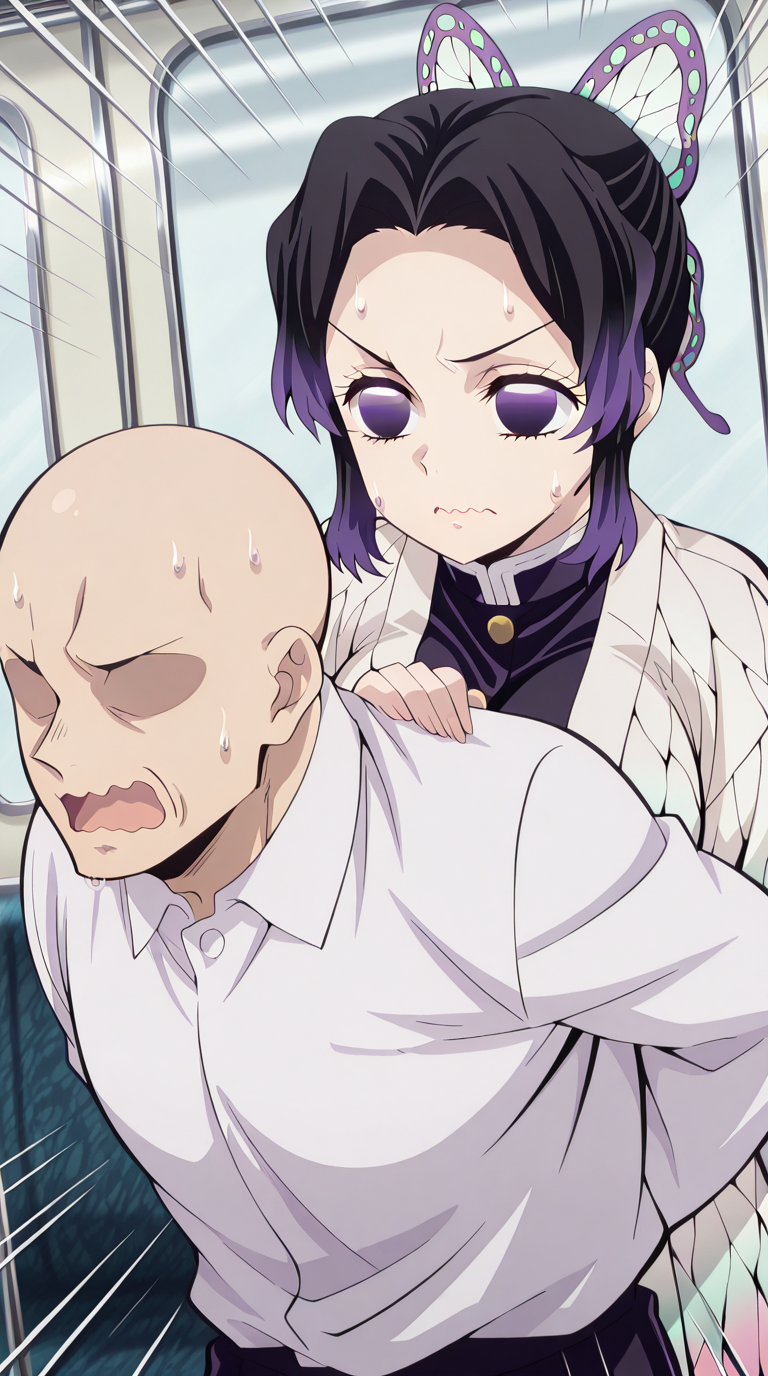 lora:restrained-illustriousxl-lora-nochekaiser:1, restrained, 1boy, emphasis lines, front-to-back, train interior, hand on another's shoulder, hand behind back, looking at another, sweat, serious, open mouth, wavy mouth, closed mouth,