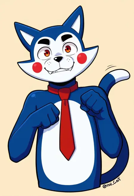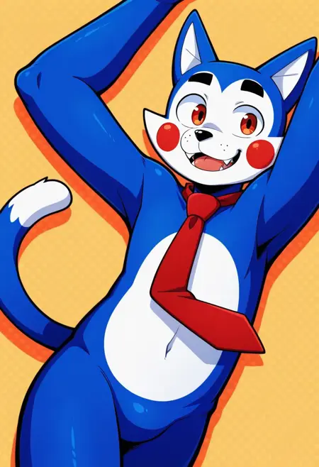 male, solo, anthro cat, blue body, white stomach, white face, white inner ears, white cheek tufts, necktie, fangs, red necktie, red eyes, red cheeks, cat tail, white tip tail, necktie only, black nose, black eyebrows