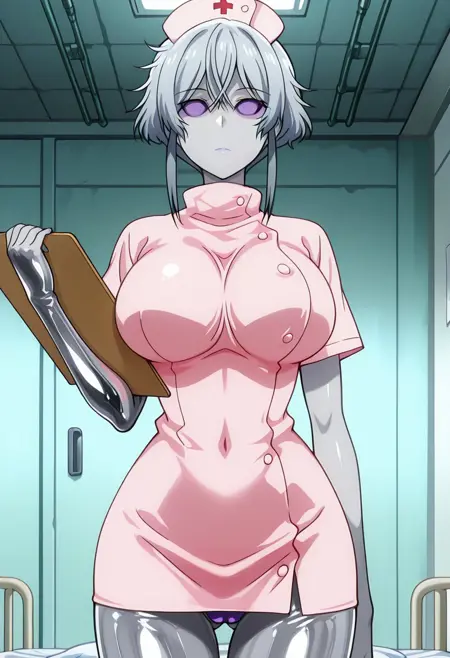 MicroGirlKiara, 1girl, solo, 成熟女性, 短发, 凌乱头发, 银浅灰色头发, 短发带长发束, 侧发, 头发遮住眼睛, 紫色巩膜, 无瞳孔, 嘴唇, 曲线优美, 锁骨, 紫色臂环, 着色皮肤, 银浅灰色皮肤, 有光泽皮肤, 金属质感皮肤, 巨大胸部, 曲线优美, 紧致腹部, 肚脐, 宽臀, 纤细腰身, 肥厚阴阜, 裸体, 紫色乳头, 发光乳头, 身体有紫色斑纹, 侧胸有紫色斑纹, 裸手, 紫色前遮布, 臀部, 裸臀, 圆润臀部, 高跟鞋, 紫色鞋子,