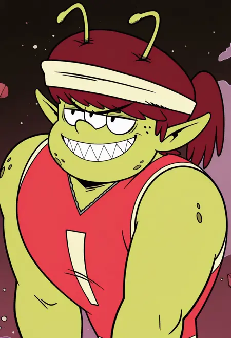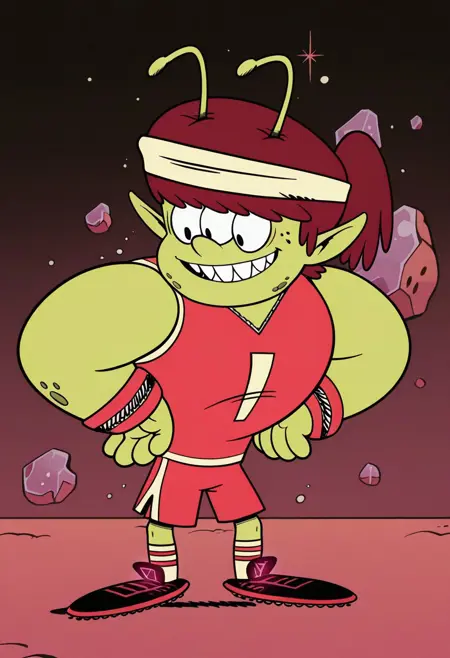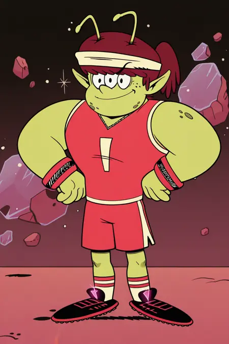 Prompt: Tricksy TLH , solo, 1girl, alien, green skin, colored skin, brown hair, ponytail, antennae, pointy ears, freckles, three eyes, black eyes, tall, muscular, white headband, red tank top, white number 1, red wristbands, red shorts, black shoes, shoes with crystal shards