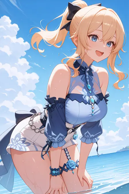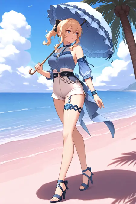 Add "sbjng, blonde hair, ponytail, long hair, hair between eyes, sidelocks, blue eyes, hair bow, black bow, blue blouse, sleeveless, see-through, detached sleeves, frilled sleeves, blue sleeves, white shorts, high-waist shorts, o-ring belt, blue bracelet, blue flower, flower thigh strap, blue sandals, high heels" for her Sea Breeze Dandelion look.