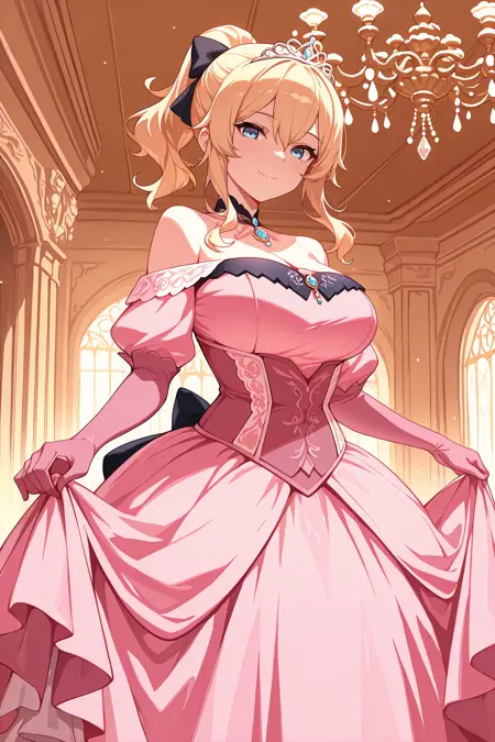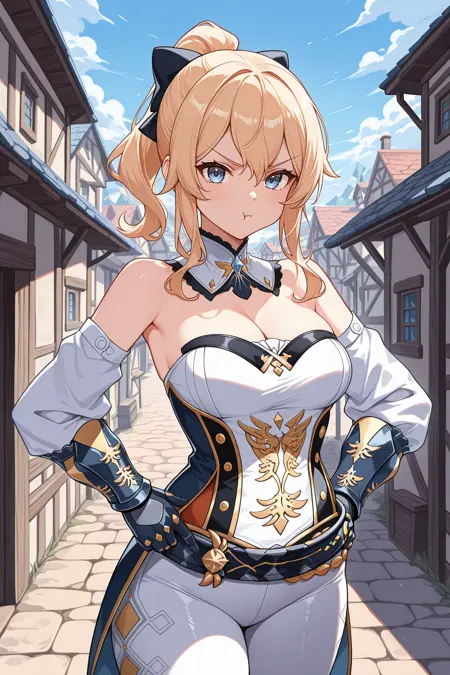 Add "defjng, blonde hair, ponytail, long hair, hair between eyes, sidelocks, blue eyes, hair bow, black bow, detached collar, black cape, two-sided capelet, strapless shirt, white shirt, detached sleeves, white sleeves, dark blue gloves, gauntlets, black belt, white pants, tight pants, dark blue coattails, white boots, knee boots" for her default look.