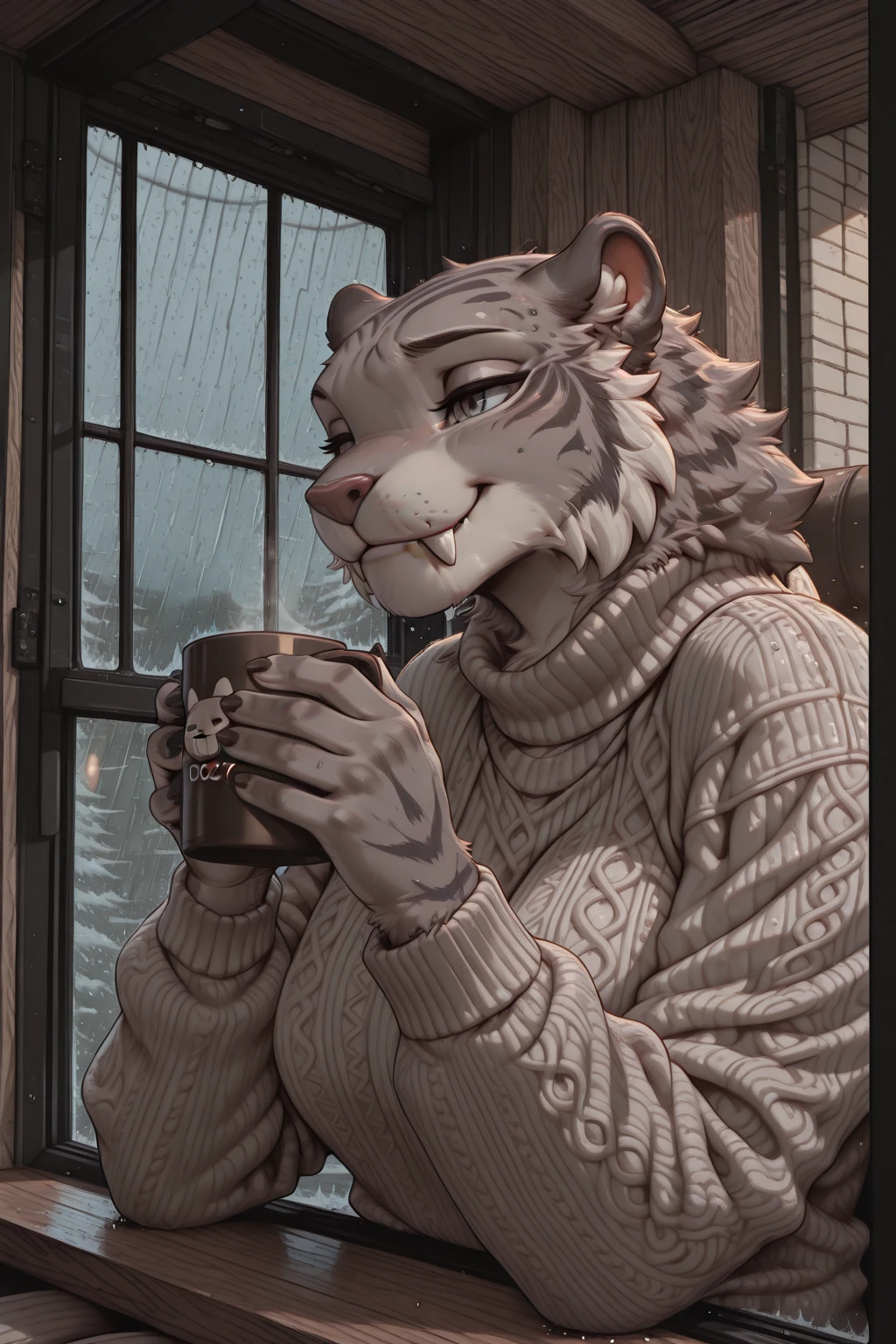 1girl, Shira, anthro sabertooth tiger, light gray fur, blue eyes, pointed ears, white markings, muscular yet feminine build, sharp teeth, claws