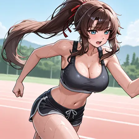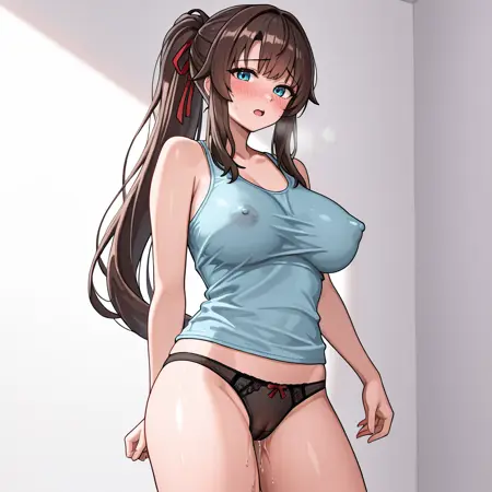 - ヘルメットなしトリガー:TermichanWithoutHelmet, 1girl, 黒手袋, 短パン, ポニーテール, 青い目, 茶色の髪, 長髪, 腹出し, ベルト, 髪リボン, タクティカル服, 前髪, 赤リボン, シャツ, クロップトップ, サイドロックス