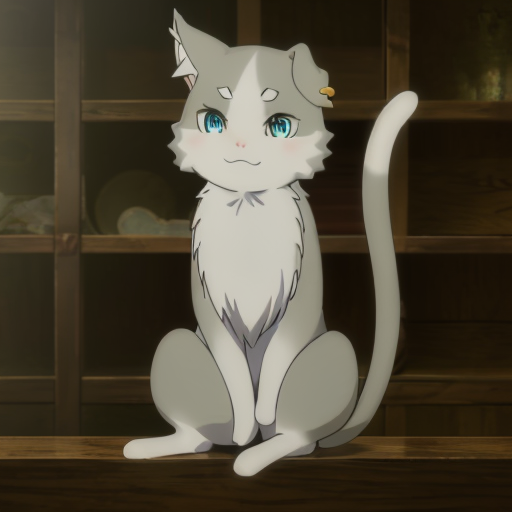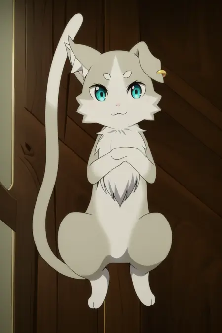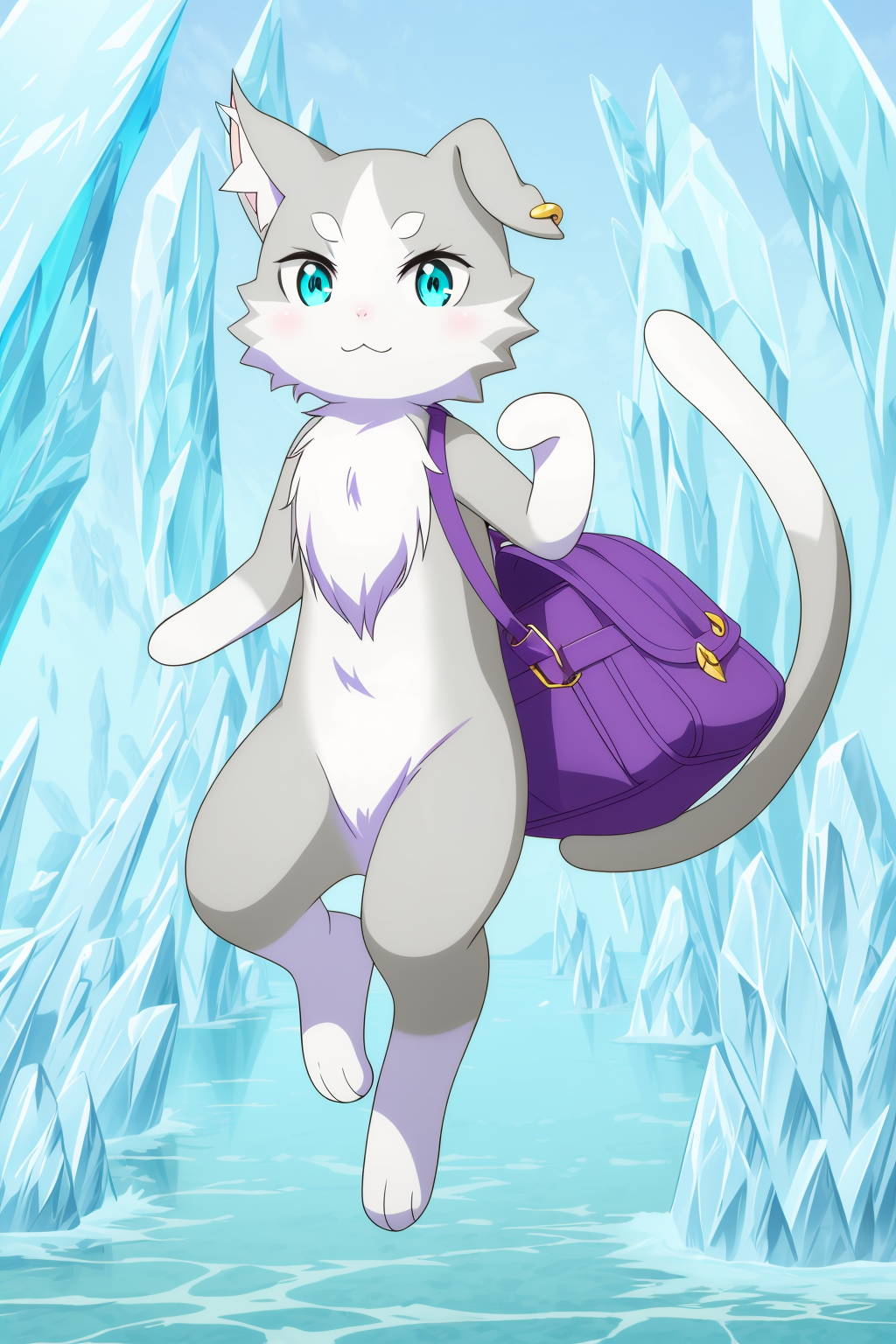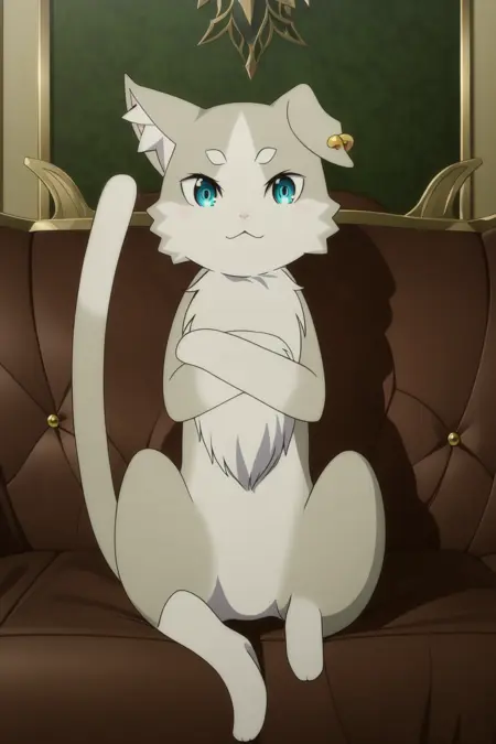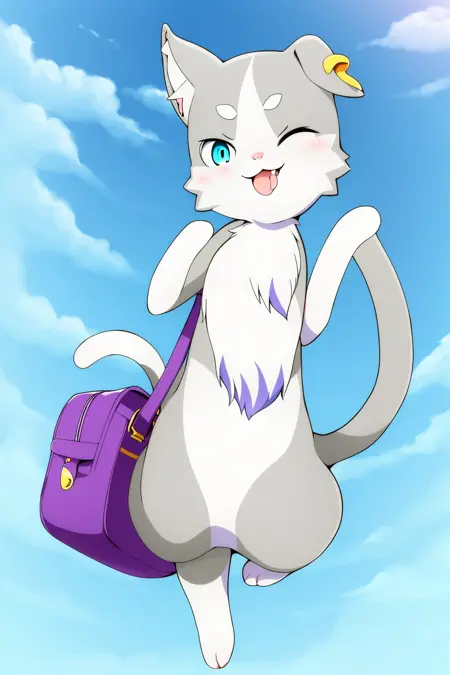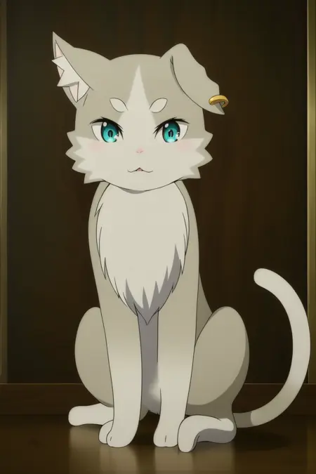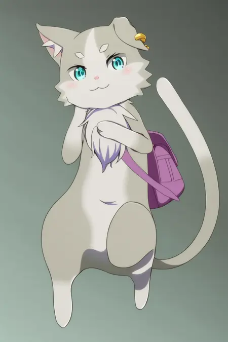 cat, 인류형 자세, 고양이 생물, 혼자, 아쿠아 눈, 긴 꼬리, 회색 꼬리, 흰 꼬리, 잎 모양 무늬, 고양이 귀 귀걸이, 곱슬머리 덩어리, 흰 고양이 손, 흰 고양이 발, 흰 눈썹, 회색 고양이 몸,