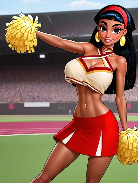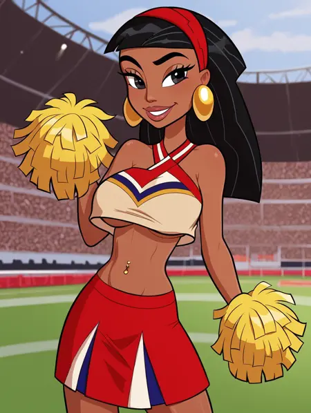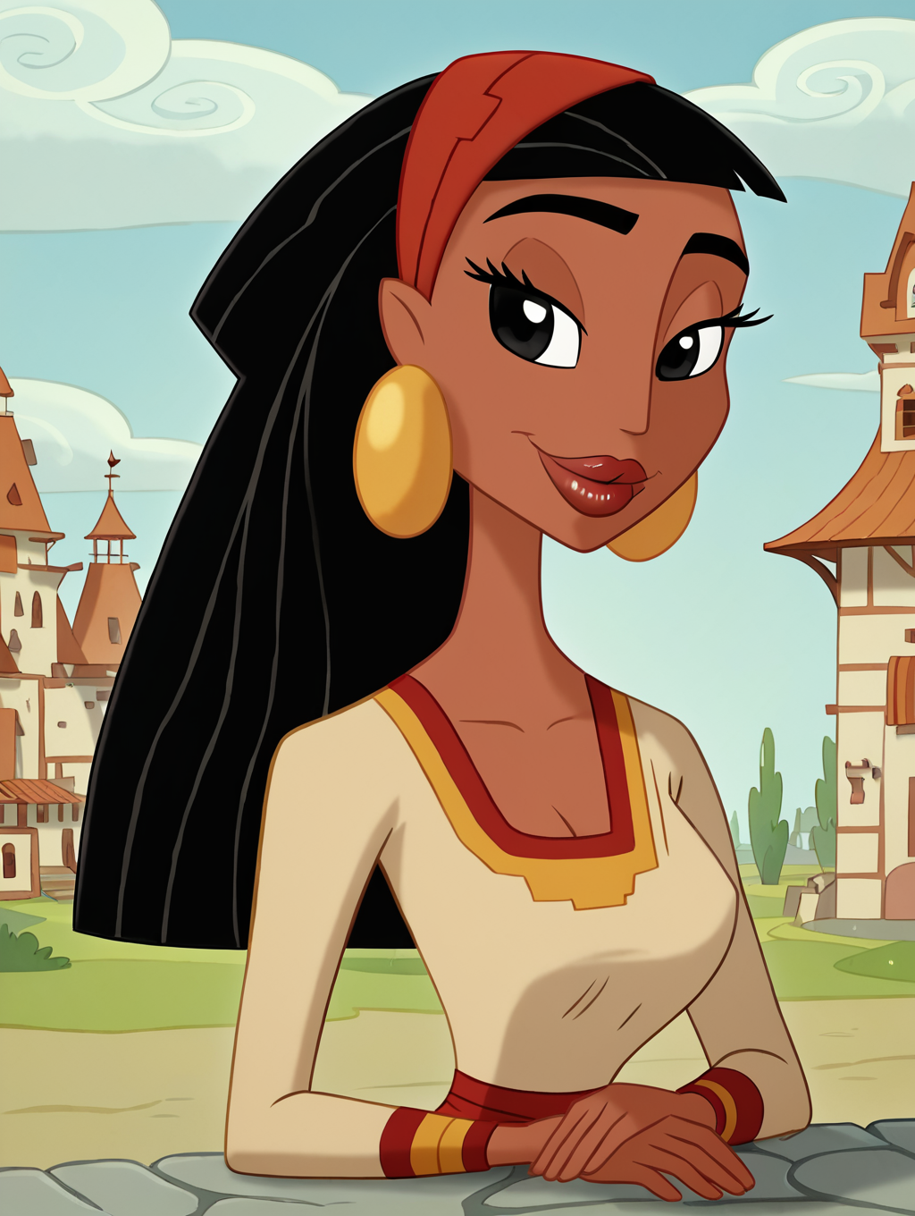malina,large golden earrings,red skirt,golden belt,beige top,black,straight, long hair,olive skin