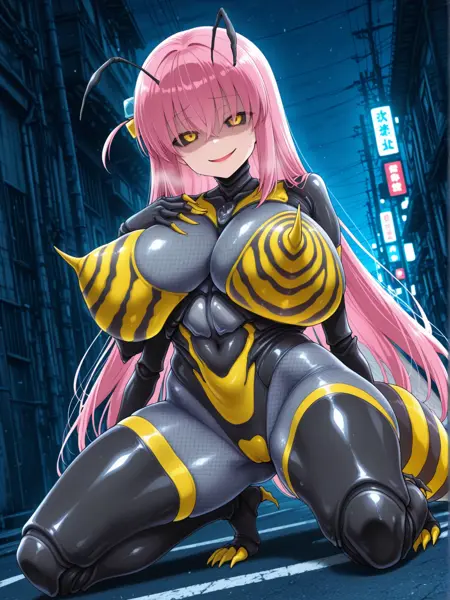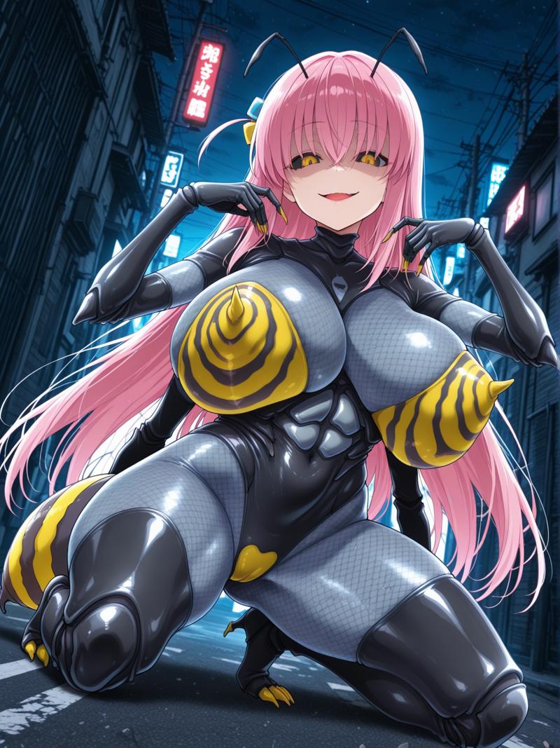触发词:节肢动物女孩、触角、怪物女孩、额外手臂、外骨骼、昆虫翅膀、爪子、黄色眼睛、紧身衣、渔网袜、腹肌、节肢动物肢体、额外眼睛、彩色巩膜、蜜蜂女孩、蜜蜂翅膀、尾巴,