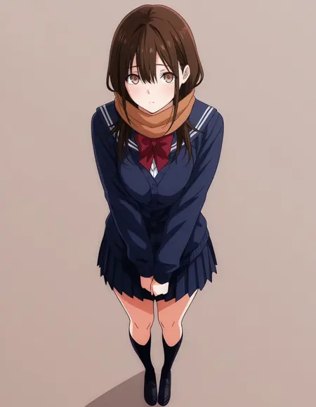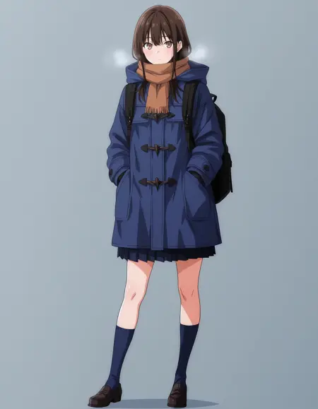 mai_kaede,long_hair,hair_between_eyes,brown_hair,brown_eyes,brown_scarf,backpack,blue_coat,hooded_coat,fringe_trim,winter_coat,duffel-coat,pleated_skirt,socks,loafers