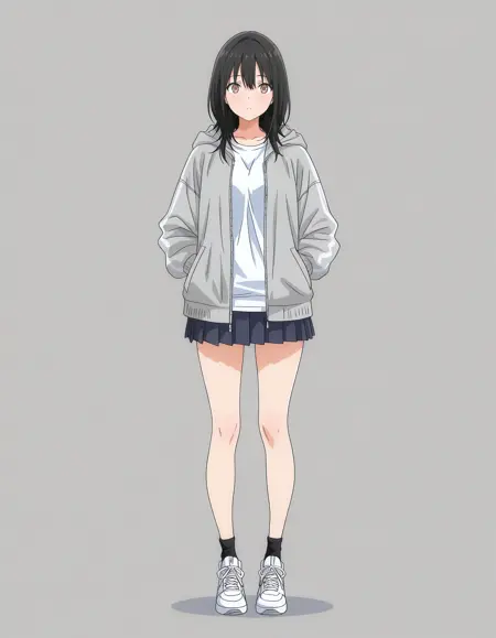 mai_sato,medium_hair,black_hair,grey_jacket,brown_eyes,white_shirt,short_skirt,socks,sneakers