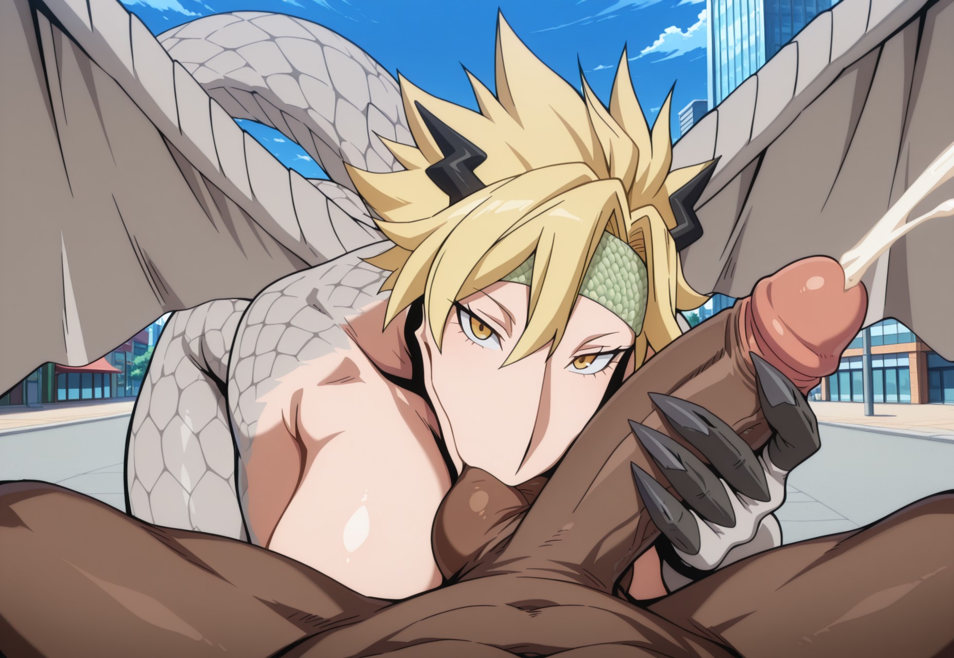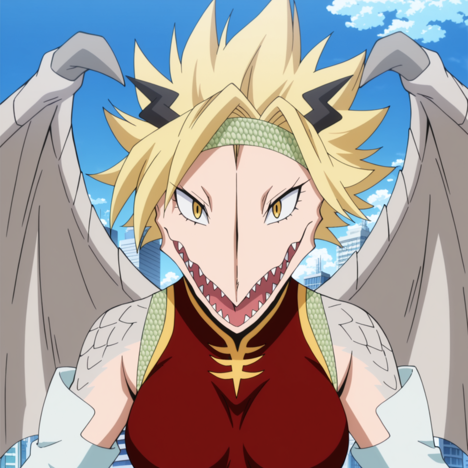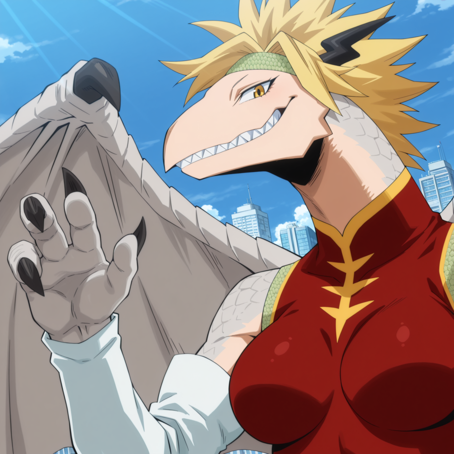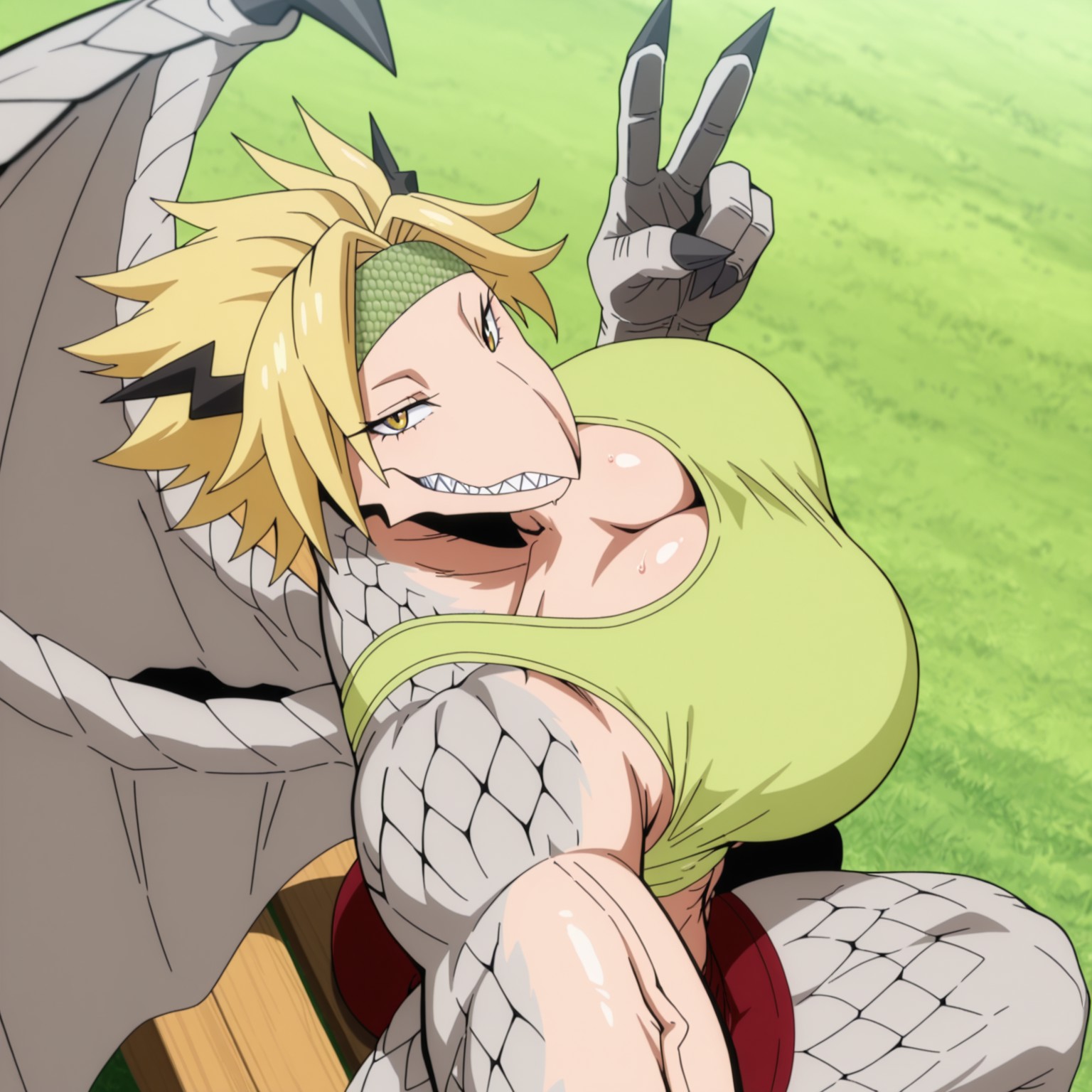 Positive Prompts: DGRT, furry female, anthro, scalie, dragon, blonde hair, spiky hair, short hair, black horns, small horns, light-green headband, yellow eyes, black pupils, noseless, sharp teeth, white skin, grey scales, grey wings, grey tail, long tail, grey legs
