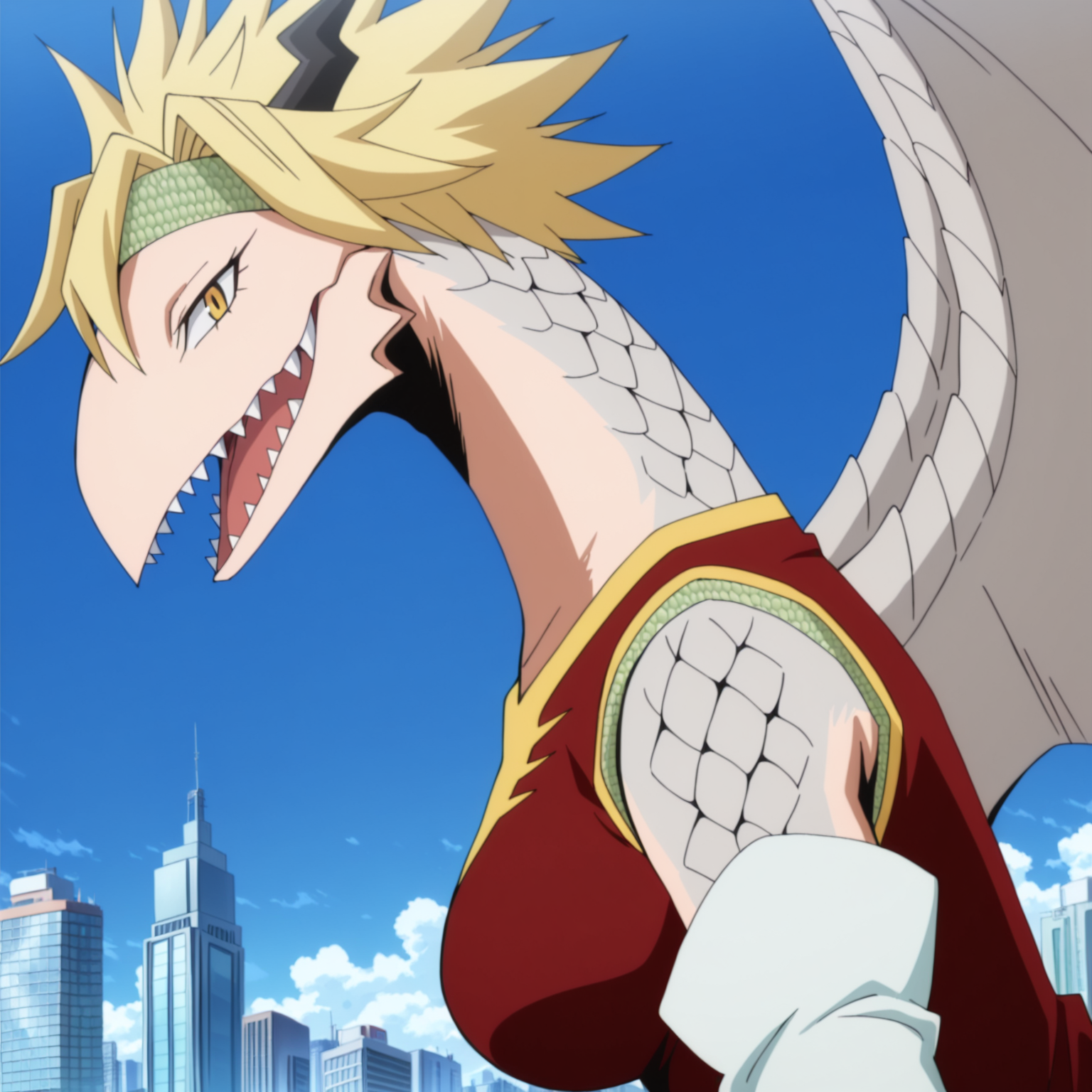 Ryuko Tatsuma in her dragon from from My Hero Academia. I have trained this with about 30 screencaps from the anime in 1080p with no fanart included. This character lora is really dependent on what checkpoint you use because her skin pattern is pretty unique, so using a furry based checkpoint will highly likely change the way her skin looks or change her dragon design completely. Some issues pertain to her qipao pattern around the neck continuing to generate more on the side of her shoulder, the teeth not generating great for portrait and full body shots, the horns generating more like antlers, and especially her silver claw guards not even showing up or generating right. Other than those issues above, the lora works fine and will at least get the character's facial appearance and body type right. Lora works best with face focus shots or side view angles. Use WAI or Banana Splitz checkpoint for best results.