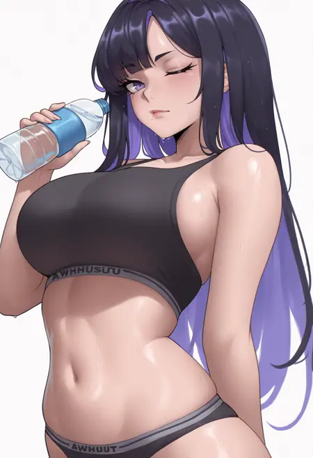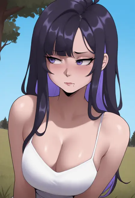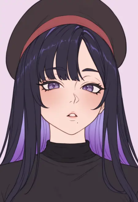 Character Tags: purple eyes, black hair, purple hair, colored inner hair, long hair, mole under mouth