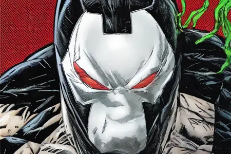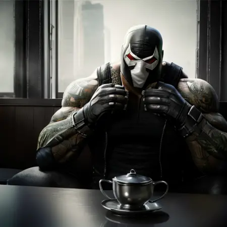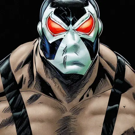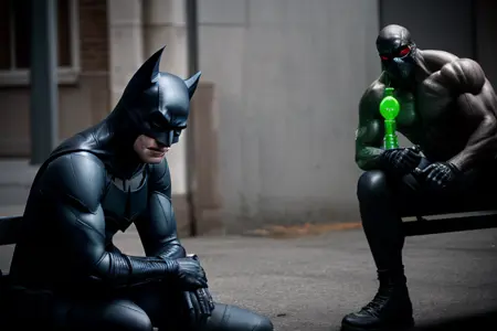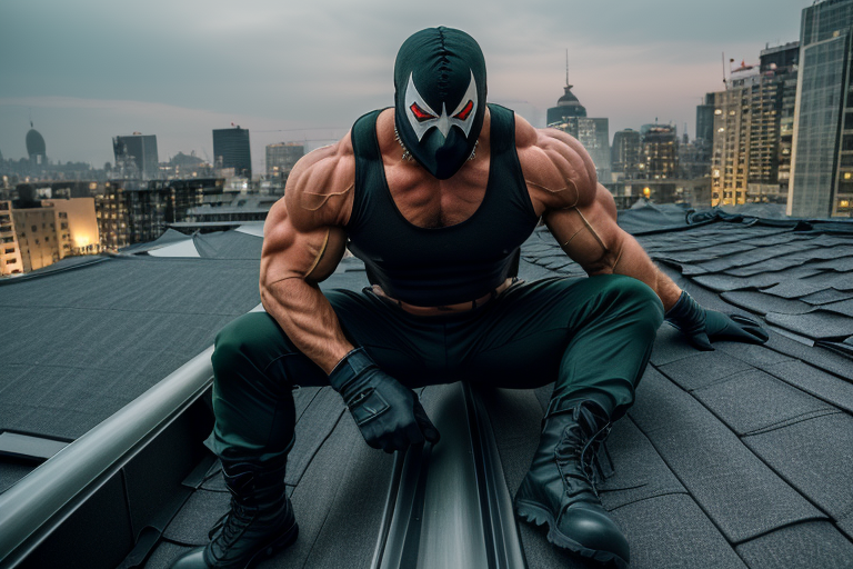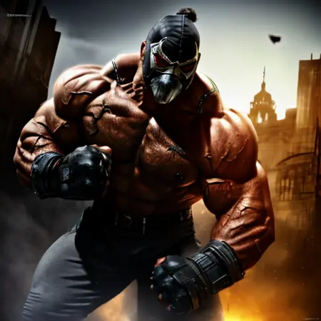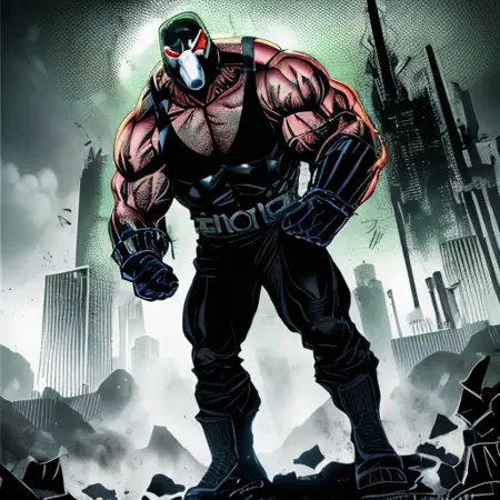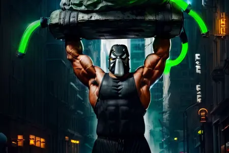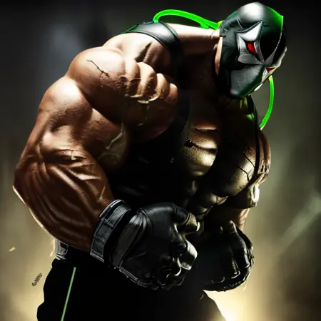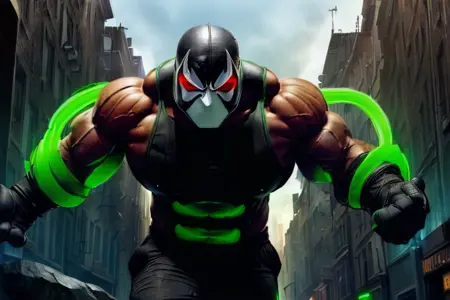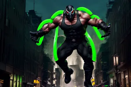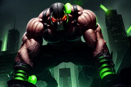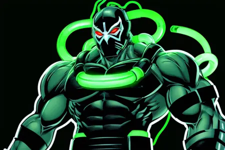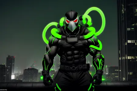 Trigger: black white mask, green thick veins, green glowing tubes on arm and head, extremely large muscular, man, red glowing eyes, gloves, tank, top, pants, boots, armor
