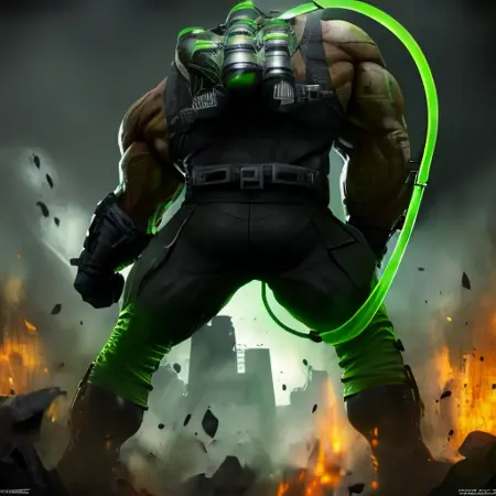 트리거: 흑백 마스크, 녹색 두꺼운 정맥, 팔과 머리에 녹색 빛나는 튜브, 매우 거대한 근육질의 남자, 빨간 빛나는 눈, 장갑, 탱크, 상의, 바지, 부츠, 갑옷