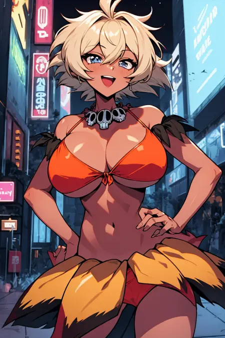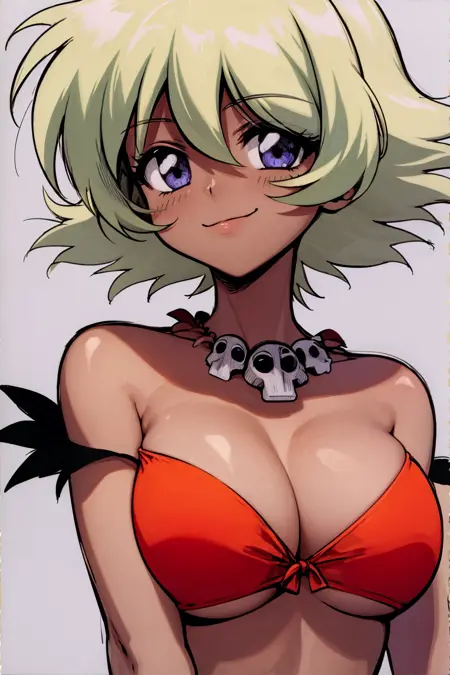 其他提示词:1girl, blonde hair, short hair, blue eyes, earrings, necklace, dark skin, bikini, swimsuit, navel, cleavage