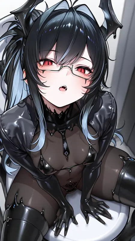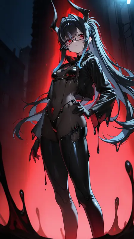 示例提示词: 泥浆女孩,黑发,红眼,多色发,长发,角,小胸,马尾,刘海,嘴下有痣,