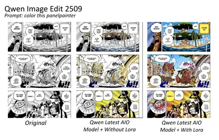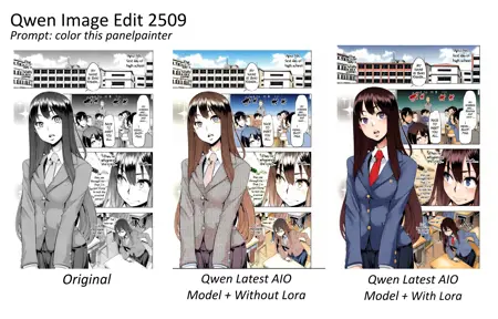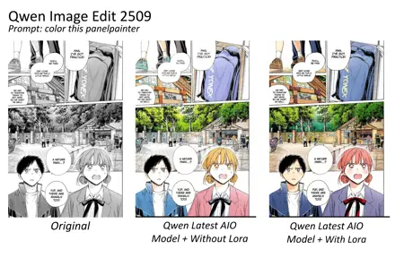 PanelPainter 是一个实验性辅助 LoRA,专为在使用 Qwen Image Edit Plus / 2509 模型时协助漫画与同人作品上色而设计。它并非独立 LoRA——为获得最佳效果,请将其与 Qwen-Rapid-AIO-NSFW-v8.safetensors 配合使用。