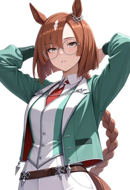 トリガー: 1girl、solo、ホーステール、ロングヘア、マルチカラーの髪、茶色の髪、非対称の前髪、編み込みポニーテール、単一の編み込み、動物の耳、耳飾り、茶色の目、眼鏡、丸い眼鏡、緑のコート、テールコート、コートの後ろの襟、開いたコート、ロングスリーブ、白いベスト、白いシャツ、カラー付きシャツ、赤いネクタイ、白いパンツ