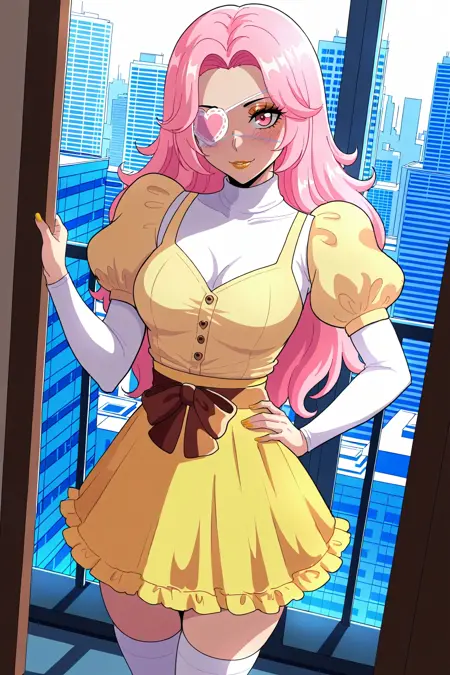 | Trained Words | 1girl, solo, yellow theme,Copied! estirinyellow, pink eyes, black sclera, glowing eyes, face mask, diffraction, yellow bridal veil, eye mask, yellow eye mask, pink hair, twintails, long hair, very long hair, double bun, hair ornament, ornament, makeup, lipstick, nail polish, medium breasts,Copied! missyinyellow, pink eyes, eyepatch, white eyepatch, heart-shaped eyepatch, heart, pink hair, hair worn down:0.7, long hair, very long hair, makeup, lipstick, nail polish, medium breasts,Copied! |