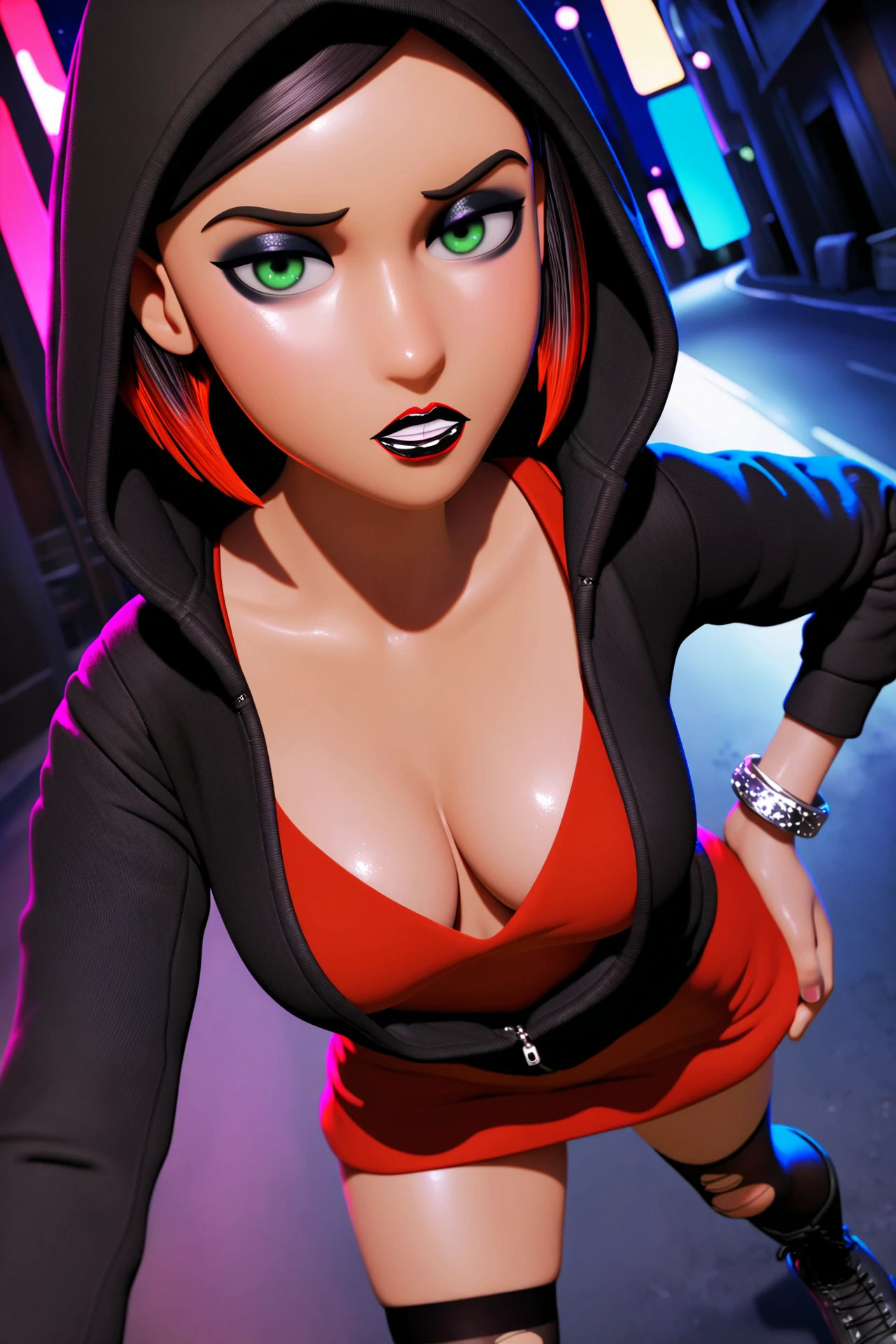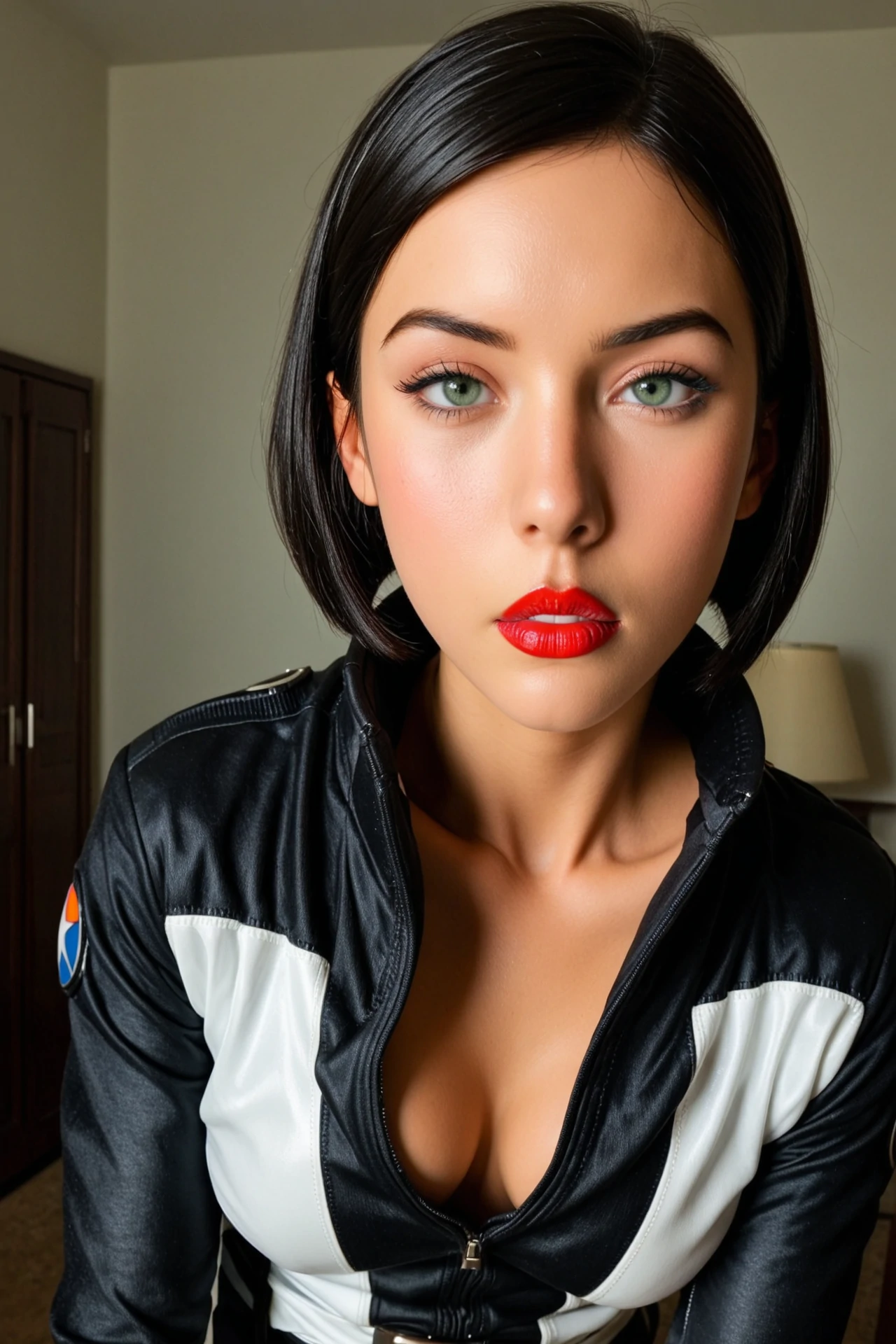 tmstyle, tmsasha, green eyes, black hair, short hair, makeup, lipstick, red lips,