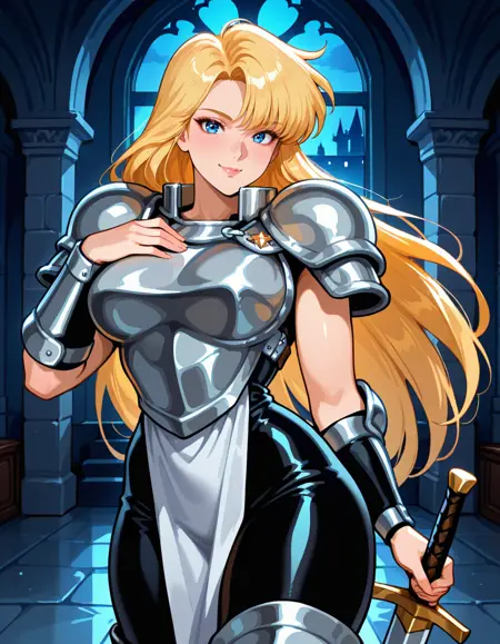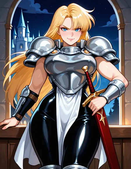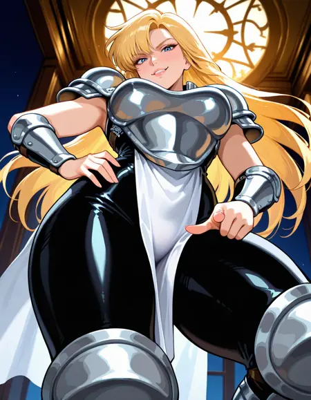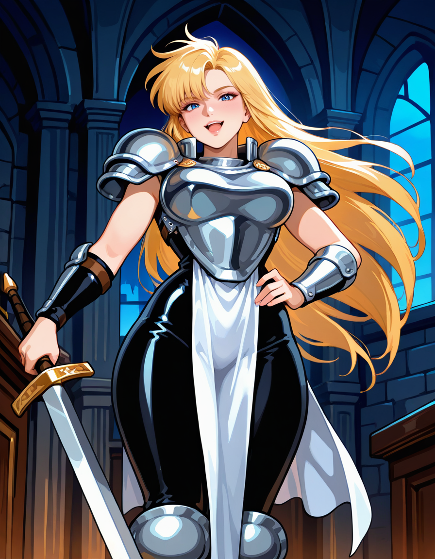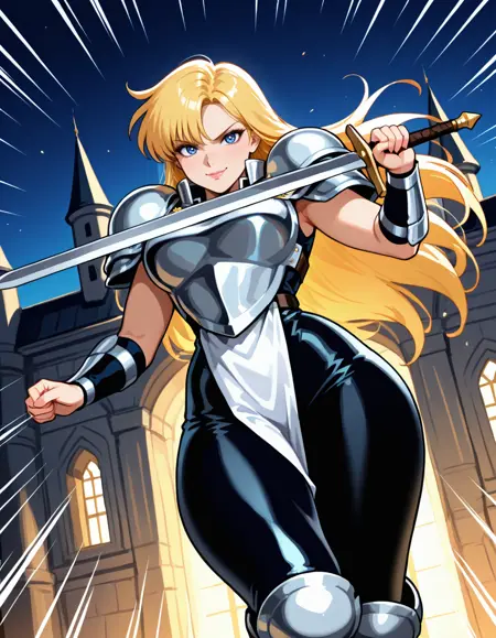 | 학습된 단어 | (retro artstyle:0.8), (jeanne-darc, blue eyes, blonde hair, long hair, bangs, lips, large breasts, wide hips, thick thighs), (armored dress, boobplate, shoulder armor, bare arms, arm guards, pelvic curtain, skin tight, knee armor, armored boots), (holding sword)복사됨! (laughing, ^_^, open mouth, facing up, holding sword, sword up, hand on own hip:1.4)복사됨! (slashing:1.5), (fighting)복사됨! |