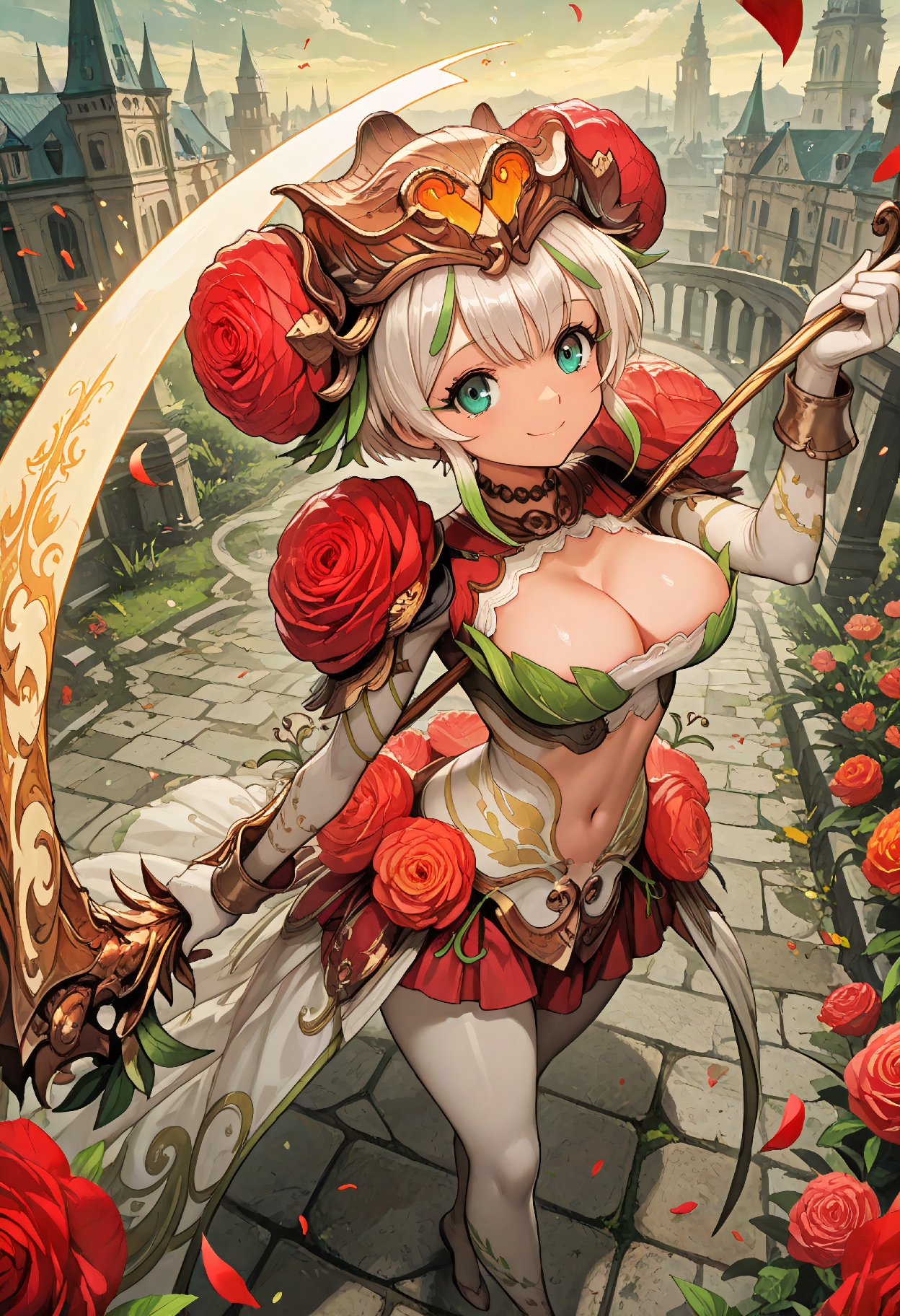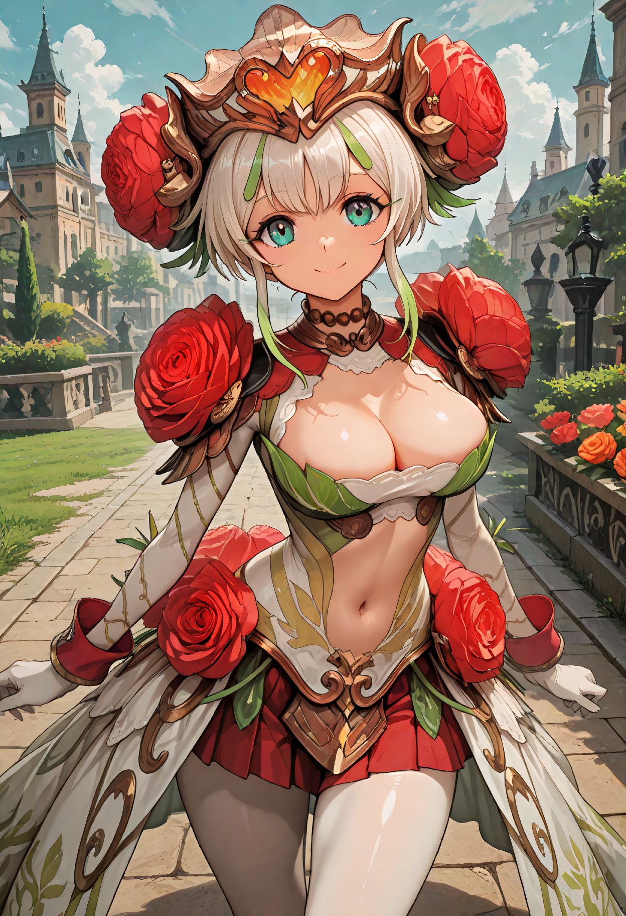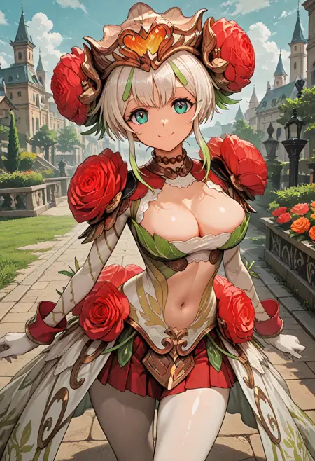 아샤(카드파이트!! 바ンガード), 다색 머리카락, 녹색 머리카락, 흰색 머리카락, 단발, 녹색 눈, 머리 장식, 머리에 꽃, 더블 버니, 빨간 꽃, 장미, 꽃잎, 중간 크기 가슴, 가슴 사이 틈, 장갑, 배꼽, 팬티스타킹, 치마,