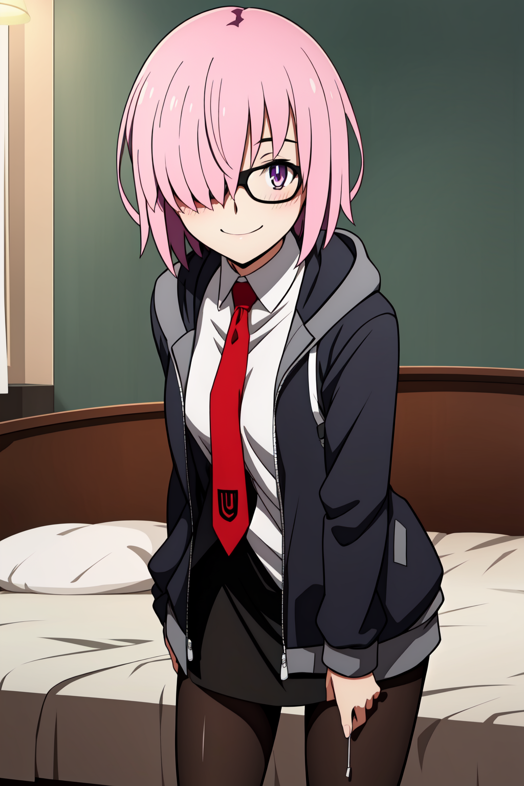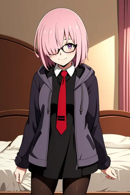 의상: 드레스, 재킷, 팬티스타킹, 열린 옷, 넥타이, 안경, 후ood, 검은 드레스, 열린 재킷, 검은 팬티스타킹, 빨간 넥타이, 회색 재킷,