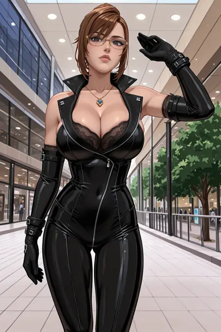 reiko_onechslayer, 1girl, solo, brown hair, jewelry, glasses, necklace, large breasts, cleavage, bodysuit, gloves, elbow gloves
